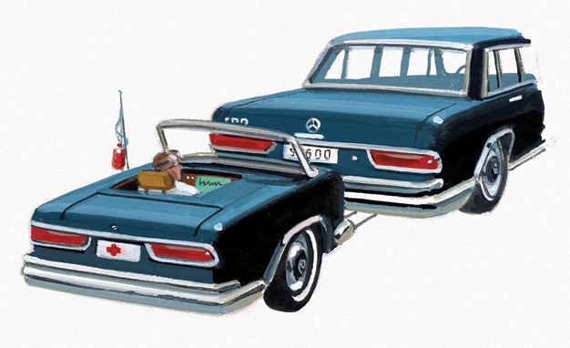 The Mercedes 600 Pullman stinted on nothing in behalf of its occupants’ well-being, towing a two-wheeled trailer, or Krankenanhänger, complete with an onboard surgeon, blood-transfusion equipment, a heart monitor, an X-ray machine and – typically thoughtful flourish – a Mercedes-quality cremation urn. A replacement Mercedes 600 Pullman, following 100 meters behind, in turn pulls its own Krankenanhänger, which carries a pretty nurse.