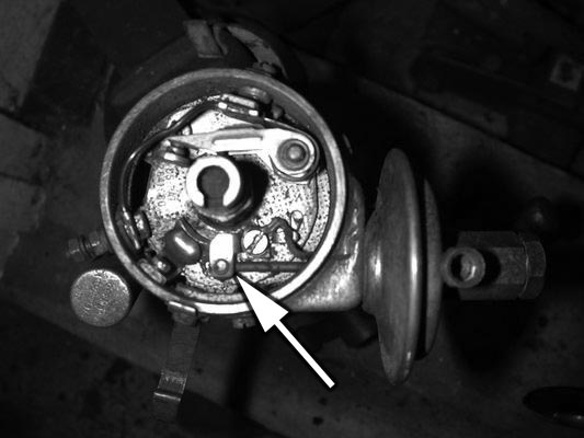 So what does the vacuum advance unit do? The vacuum advance system consists of a vacuum diaphragm mounted on the distributor body. The diaphragm is spring-loaded in the zero-advance position, and has a rod that connects to a hole in the breaker plate (see arrow in pic below), which is the movable plate the points (or ignition sensor) are mounted on.